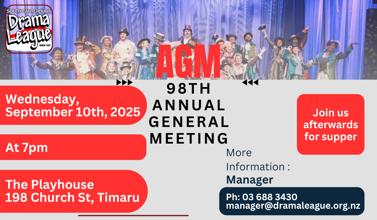 The South Canterbury Drama League Inc. will be holding it’s 98th Annual General Meeting on Wednesday 10th September at 7pm.